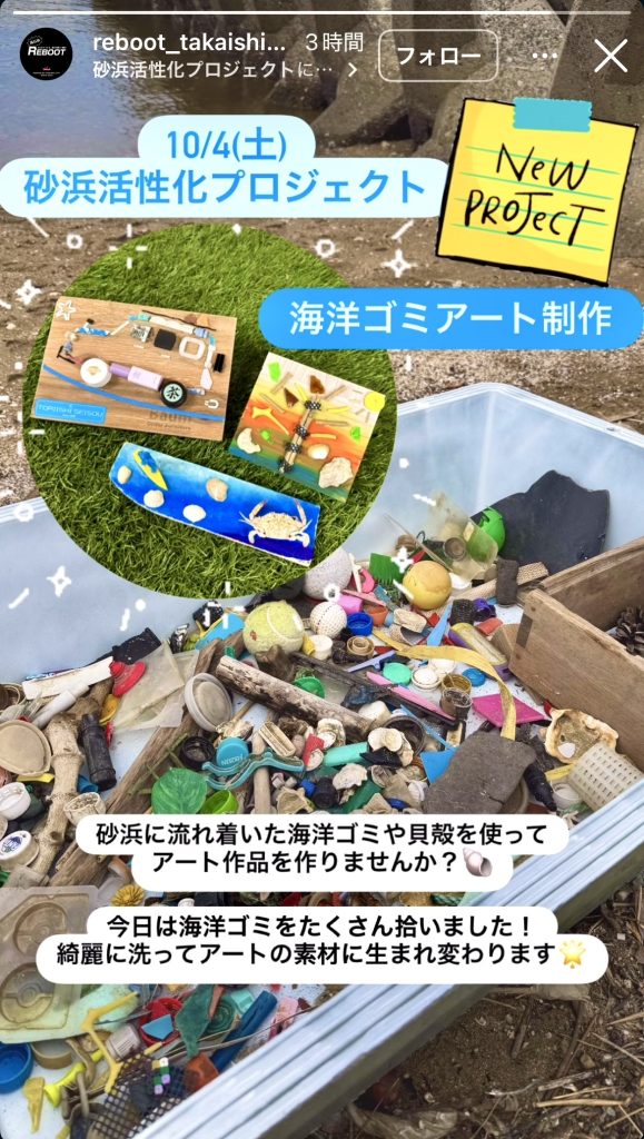 これまでも砂浜活性化プロジェクトでは、砂浜の清掃活動を行なってくださっていたみたいですが、何かお手伝いできることがないものかと考えていた時に「海洋ごみを拾ってアートを作ろう🐟」ということを思いついて今回プロジェクトに参加することにしました。