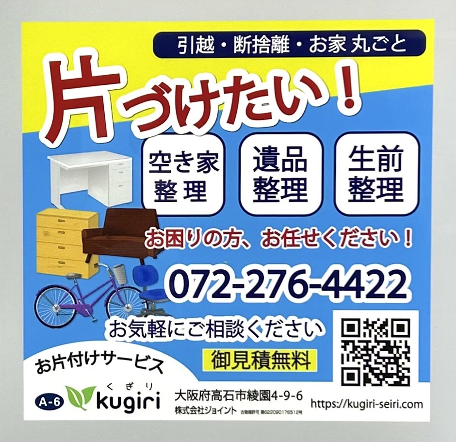 高石市で「遺品整理」「生前整理」「空き家のお片付け」「今住んでいる家のお片付け」などお家のお片付けでお悩みの場合は、お片付けサービスkugiri(下記のお電話またはお問合せフォームより)までお気軽にご相談ください😊