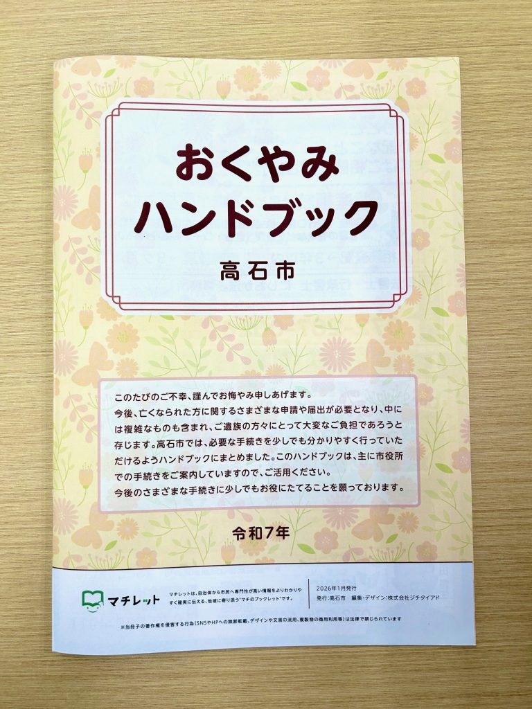 『おくやみハンドブック 高石市』とは…… ご身内の方が亡くなられた場合、様々な申請や届出が必要となり、ご遺族の方々に大変な負担がかかります。そのような手続きを少しでも分かりやすく行っていただけるようにという目的で高石市が発行しています。